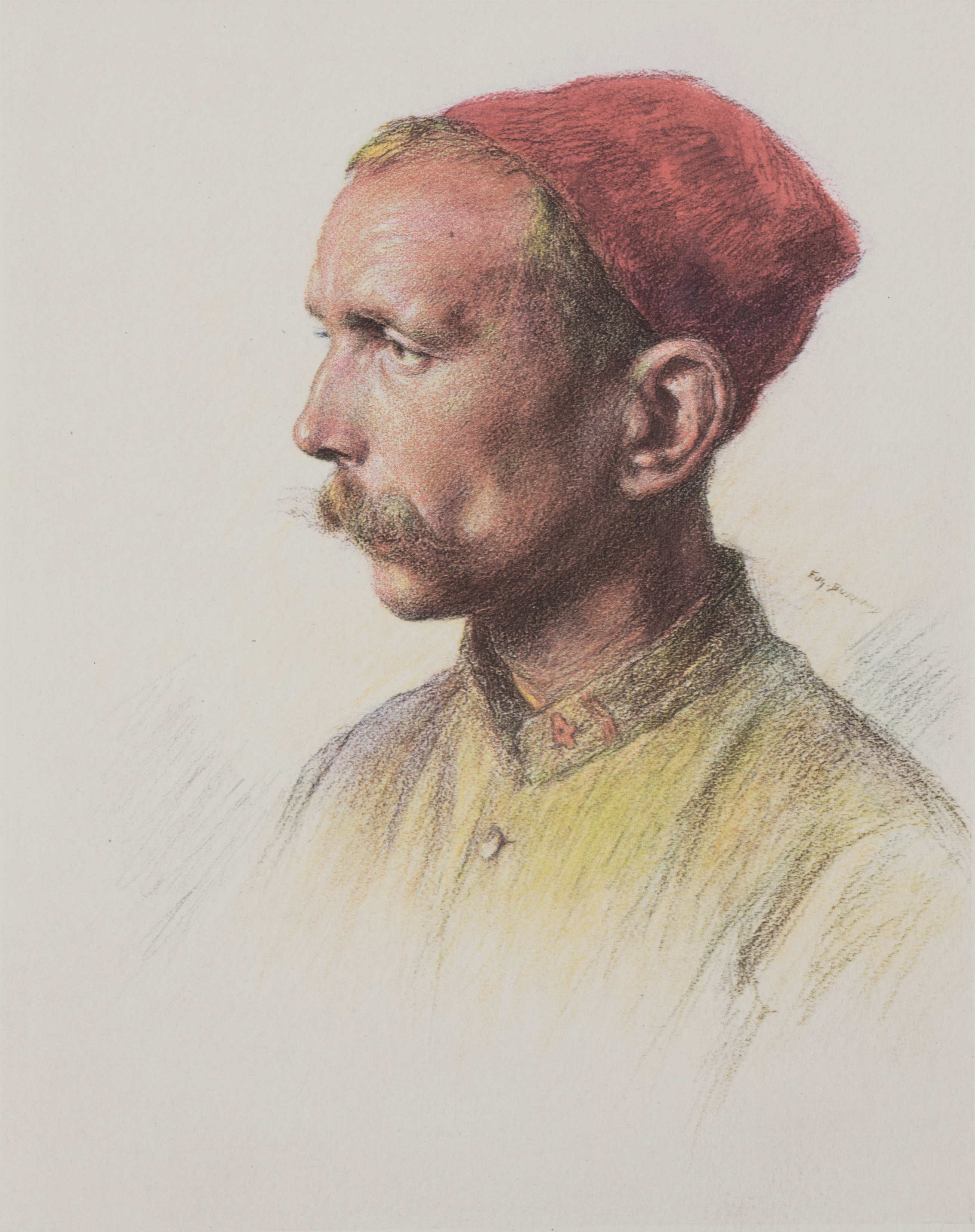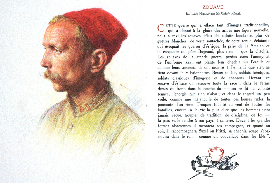 This war which has wiped out so many traditional images, which has given a new look to the glory of the forces’ uniforms, has robbed us of the Zouaves. No longer do we see the baggy trousers, the white leggings, the braided jacket; this brilliant dress which evoked the north African wars, the capture of Smalah (see in Wikipedia) and the helmet of father Bugeaud, nothing is left but the fez. The Zouaves of the great war, lost in their khaki uniforms, planted their fez over their ears and like their predecessors, they demonstrated to the enemy that nothing could resist their bayonets. They were fine heroic soldiers, renowned in imagery and song. Looking at this Zouave from Alsace we rediscover all of his kind: in the firm shape of his brow, in the curve of his chin is revealed the tenacious willpower, the energy which nothing will overcome; and in his slightly veiled expression, like a melancholy born of all those harsh times, the pursuit of a dream. A trooper, whipped by the wind of all those battles, hardened by the harshest life men have ever lived through, traditional trooper with discipline and faith, the peace will return him to his country, his land. Outside the large farms of Alsace he will recount his campaigns, and when in the evenings he will walk again with Suzel or Fritzi, his red fez will be illuminated like a poppy in the cornfield.