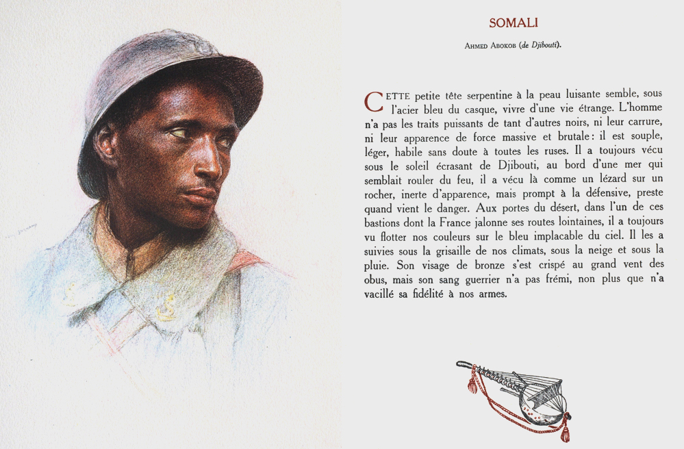 The little serpentine head with shining skin seems, under the blue steel helmet, animated by a strange life. The man does not have the powerful features of so many other dark-skinned men, nor their broad stature, nor their appearance of brutal and massive strength: he is lithe, light and no doubt skilful in all the tricks of war. He has always lived under the oppressive sun of Djibouti, on the edge of the sea, which seems to roll with fire. He has lived like a lizard on a rock, seemingly motionless, but quick to defend himself, agile when danger comes. At the gates of the desert, in one of those bastions with which France stakes out its distant routes, he has always seen our colours floating against the implacable blue sky; he followed them under the greyness of our climate, under the snow and the rain. His bronzed face has contracted under the great blast of shellfire, but his warrior blood has not shivered, nor has his faithfulness to our service wavered.