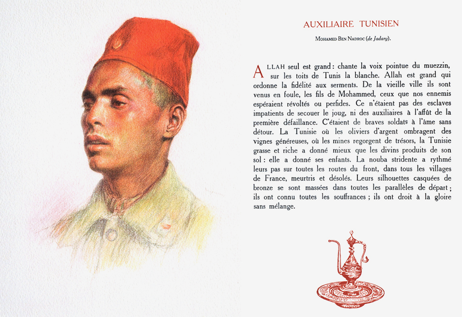 Allah alone is great, chants the shrill voice of the muezzin, floating over the roofs of the white buildings of Tunis. Allah is great, when he orders faithfulness to oaths. From the old city they came in crowds, the sons of Mohammed, whom our enemies hoped would revolt or prove treacherous. But these were not slaves, anxious to shake off their yoke, nor auxiliaries on the lookout for the first sign of weakness. They were brave soldiers whose hearts were without subterfuge. Tunisia, where silver olive trees shaded fruitful vines, where mines gave up their treasures; Tunisia the bountiful and rich gave more than the heavenly produce of her soil: she gave her children. The strident nouba, their military music, kept their feet in rhythm along all the routes of the front, in all the villages of France, bruised and desolate. Their silhouettes in bronze helmets were massed at all the points of departure. They shared all the sufferings; they earned the right to unalloyed honour.