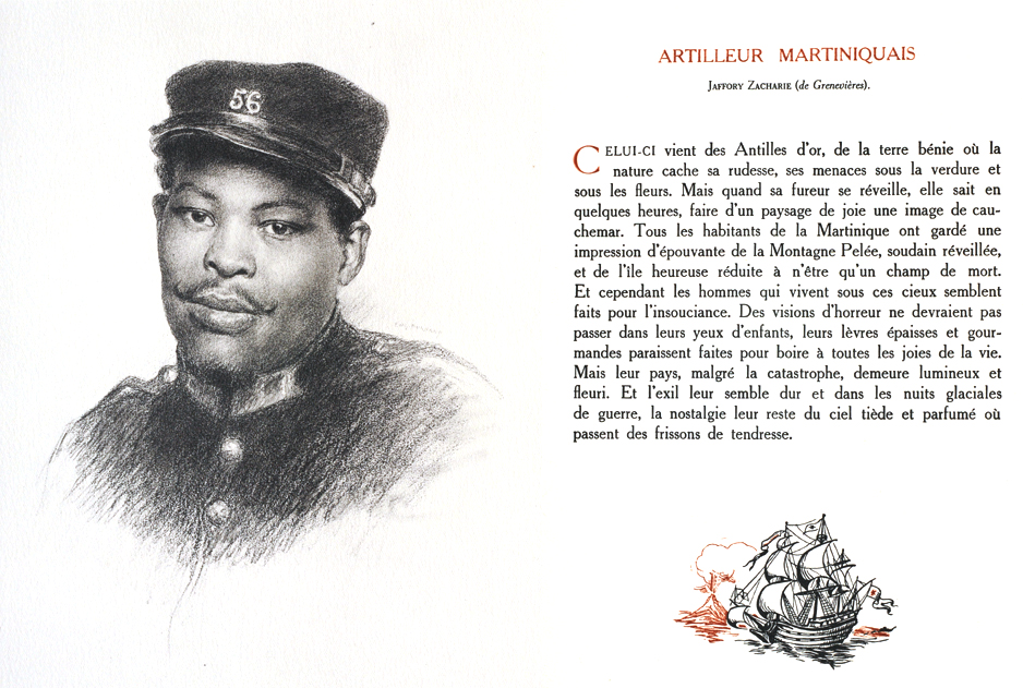 This one comes from the golden Antilles, blessed land where nature hides her rough aspects and threats under greenery and flowers. But when her fury awakes she knows in a few hours how to turn a joyful landscape into a nightmare. All the inhabitants of Martinique have memories of the shocking impression of Mount Pelée, suddenly awakened, reducing the happy island to a field of death (see in Wikipedia). Yet the people who live under these skies seem made for a carefree life. Visions of horror should not pass before their childlike eyes, their fleshy lips seem made for drinking in greedily all the pleasures of life. But their country, in spite of the catastrophe, remains shining and covered in flowers. Their exile seems hard, and in the feezing nights of the war their nostalgia remains for the warm perfumed sky where shivers of tenderness pass.
