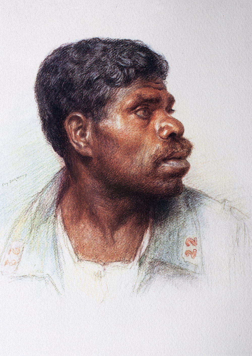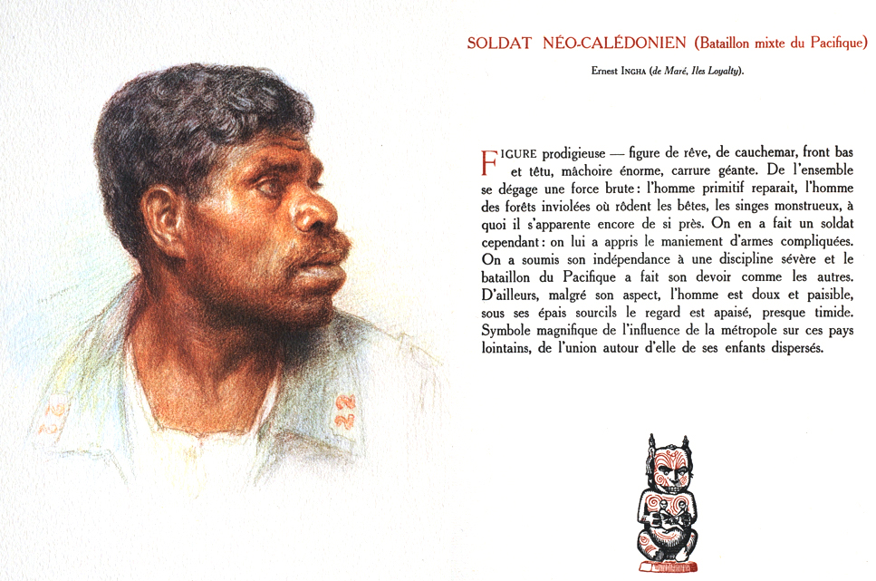 A tremendous figure, a face one might see in a dream, or a nightmare, with a low and stubborn brow, enormous jaw, giant stature. From his whole appearance brute force stands out: primitive man reappears, man of the pristine forests where beasts prowl, monstrous apes, which resemble human beings. However they made a soldier of him, taught him to handle complicated arms. He has submitted to strict discipline and the Pacific battalion did their duty as well as the others. Besides, in spite of his aspect, the man is gentle and peaceful; under his bushy eyebrows his expression is calm, almost timid. He is a magnificent symbol of the influence of the mother country on these distant lands, and of the union between her and her far-flung children.
