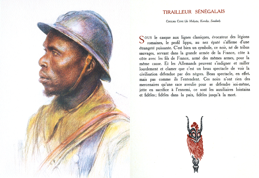 Under the classic lines of his helmet, reminding us of the Roman legions, his profile with prominent lips and flattened nose reveals a strange power. He really is symbolic, this black man, born of a wild tribe, serving in the great army of France, side by side with native Frenchmen, bearing the same arms, fighting for the same cause. And the Germans can mock and jeer loudly, proclaiming that it’s a fine spectacle to see civilisation defended by blacks. Fine spectacle indeed, but not in the way they meant. These African troops are nothing like the mercenaries whom one race subjugates to defend itself, or throws as a sacrifice to the enemy, they are faithful auxiliaries from far away, faithful in peacetime, and faithful unto death.