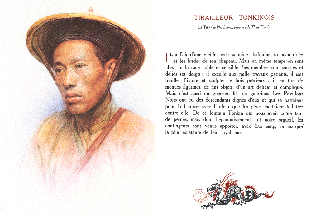 He looks like an old woman, with his foxy-faced expression, wrinkled skin and the bonnet strings holding his hat on. But at the same time one senses a noble sensitivity about him. His limbs are supple, his fingers nimble; he excells at a thousand patient tasks, he knows how to carve ivory and sculpt precious wood, which he makes into tiny figurines, fine objects fashioned with delicate and complex skill. But he is also a warrior, from a family of warriors. The Black Flags had descendants who were worthy of them and who fought for France with the valour with which their fathers had formerly struggled against her. From faraway Tonkin, which cost us so much trouble, but whose flowering makes us proud, the contingents have brought to us the most brilliant demonstration of their loyalty, with their blood.