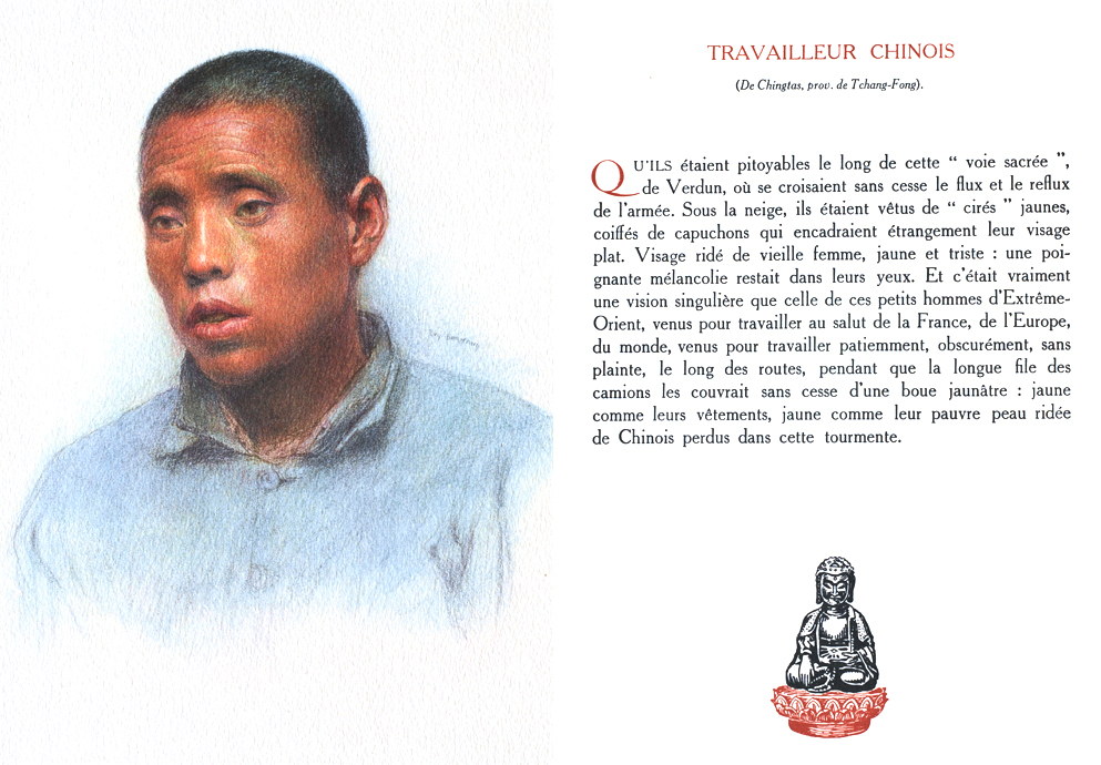 How pitiful they were all along this “sacred way” (see in Wikipedia) to Verdun, where the flux and reflux of the armies ceaselessly crossed each other’s path. In the snow they were clothed in yellow oilskins, with hoods over their heads which oddly framed their flat faces. They had the wrinkled look of an old woman, wan and sad, a poignant melancholy filled their eyes. And it was truly a strange sight, to see these little men from the Far East, come to labour patiently, humbly, uncomplainingly, for the salvation of France, of Europe, even of the world, along these roads, while the long file of lorries covered them ceaselessly in yellowish mud, yellow like their clothing, yellow like the poor wrinkled skin of a Chinaman lost in this torment.