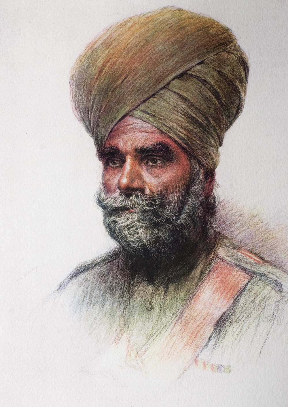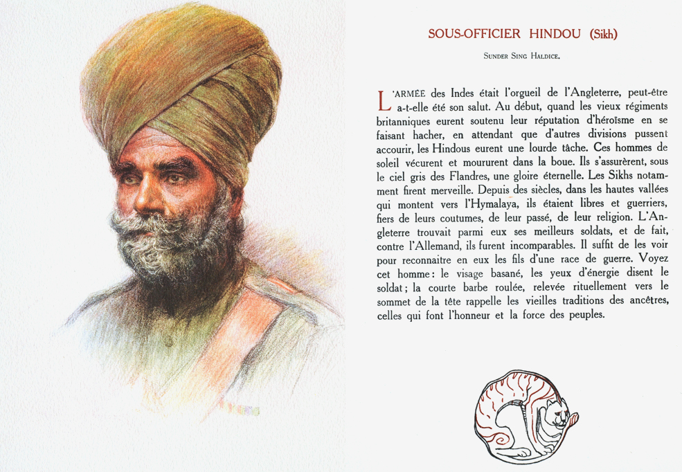 The Indian army was the pride of England, perhaps it has been its salvation. At the start when the old British regiments were upholding their reputation by being ground down while waiting for other divisions pushing hastily towards them, the Hindus had a heavy task. These men of sun lived and died in the mud. They secured for themselves under the grey skies of Flanders, eternal glory. The Sikhs were particularly wonderful. For centuries, in the high valleys that climb towards the Himalayas, they were free and warriors, proud of their customs, of their heritage, of their religion. England found amongst them its best soldiers, and in fact, against Germany, they were incomparable. It is sufficient to see them to recognise in them the sons of a warrior race. Look at this man; weather beaten face, the energy in his eyes which tells us he is a soldier; the short rolled beard lifted ritually to the top of the head, remembering ancestral traditions, which give honour and strength to nations.