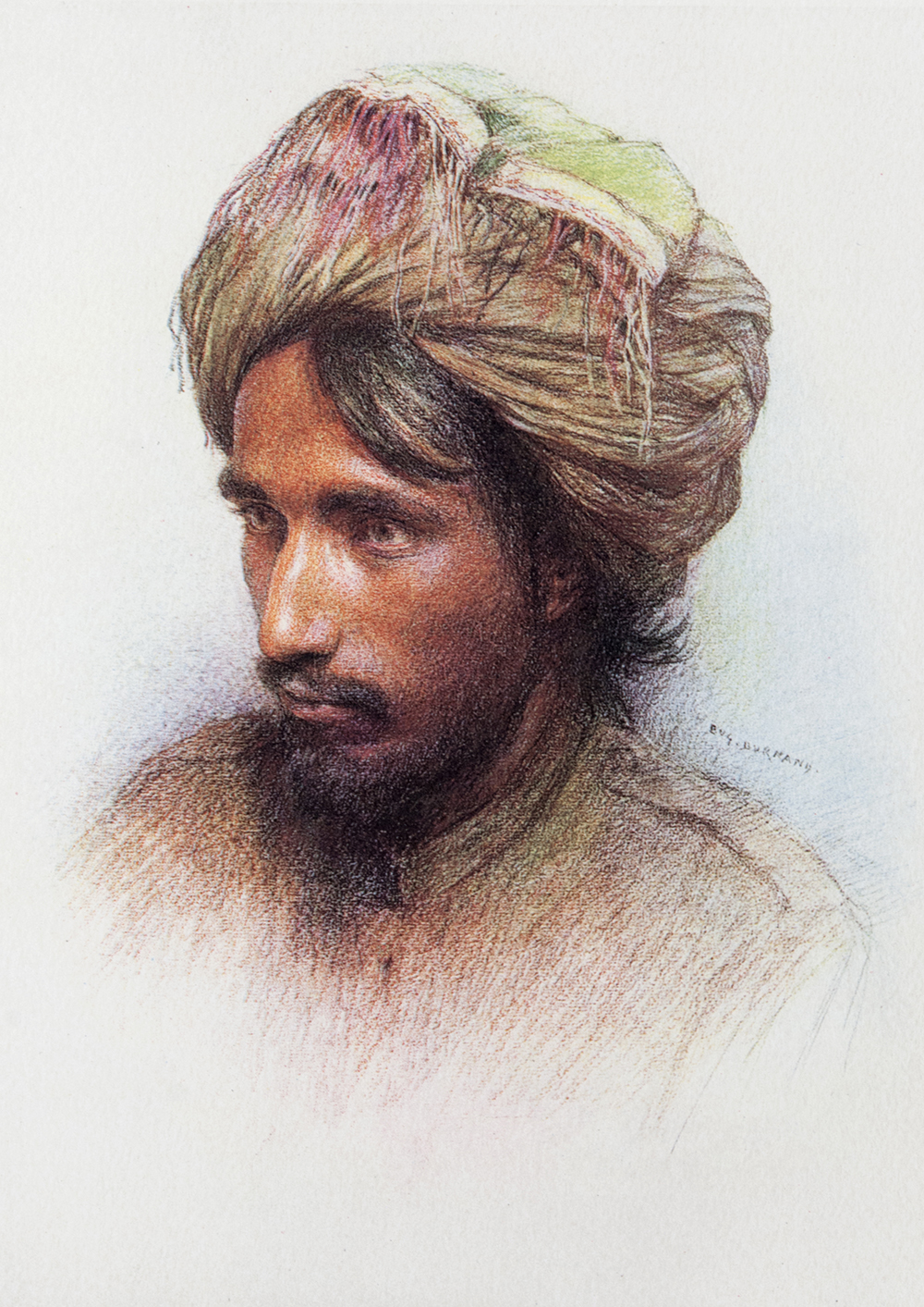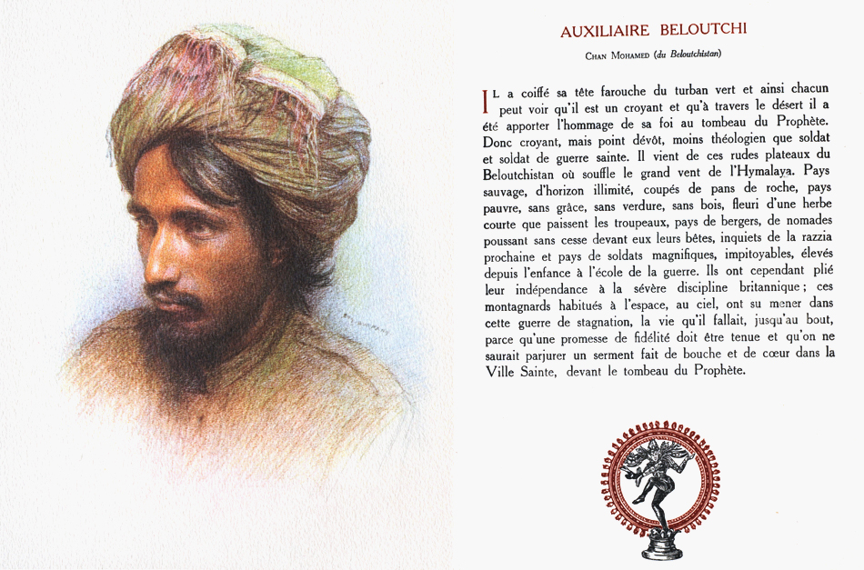 He has crowned his fierce-looking head with a green turban, so that everyone can see he is a believer and that he has travelled across the desert to pay the homage of his faith to the tomb of the Prophet. So he is a believer, but not a zealot, less of a theologian than a soldier, and a soldier in a holy war. He comes from the rugged plateaus of Balouchistan, where the great wind of the Himalaya blows. Wild country with endless horizons, broken by walls of rock, a poor country, barren, without greenery or woods, covered with short grass grazed by flocks of sheep, land of shepherds, of nomads endlessly driving their animals before them, anxious about the next raid, a country of magnificent soldiers, merciless, brought up in the school of warfare since childhood. However they did submit their independence to harsh British discipline; these mountain men used to wide open spaces and the sky knew how to lead the required life in this war of stagnation, right to the end, because a promise of fidelity had to be kept, and one could never break an oath made out loud and from the heart in the Holy City, in front of the tomb of the Prophet.