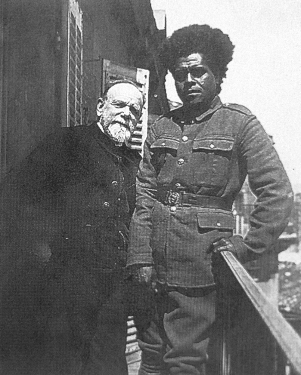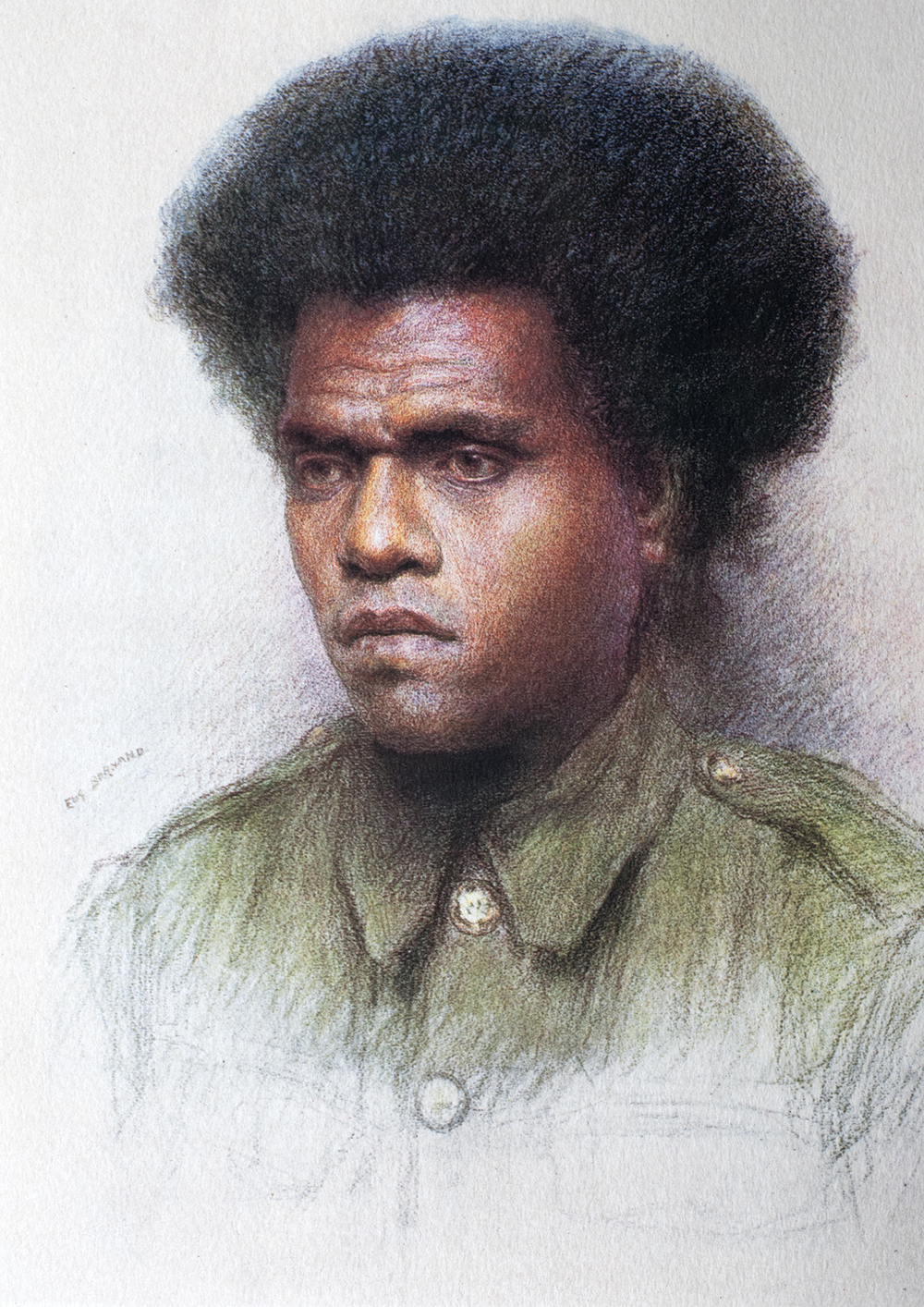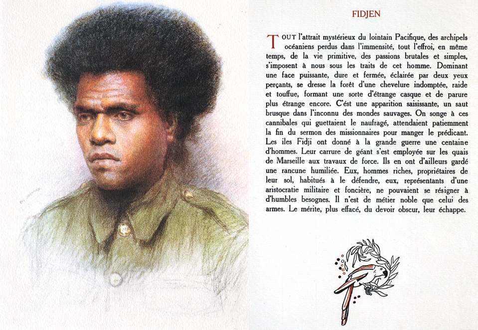 All the mysterious appeal of the far Pacific, the ocean archipelagos lost in its immensity, all the dread, at the same time, the primitive life, brutal and simple passions, impress themselves upon us by this man's features. Dominating his powerful face, hard and closed, lit up by two piercing eyes, his forest of untamed hair rises, thick and stiff, forming a kind of foreign helmet as an even stranger adornment. It is a striking appearance, an abrupt leap into the unknown world of the wild. One thinks of cannibals waiting for the shipwrecked, patiently awaiting the end of the missionaries' sermon before eating the preacher. The Fiji Islands gave the great war a hundred men. Their giant physiques were employed on the Marseille quay sides in heavy work. They have however born a humiliating grudge about it. They, rich men, owners of their land, used to defending it, they, representatives of military and landed aristocracy are unable to resign themselves to humble jobs. Bearing arms is the only noble profession. The more self-effacing merit in humble tasks eludes them.