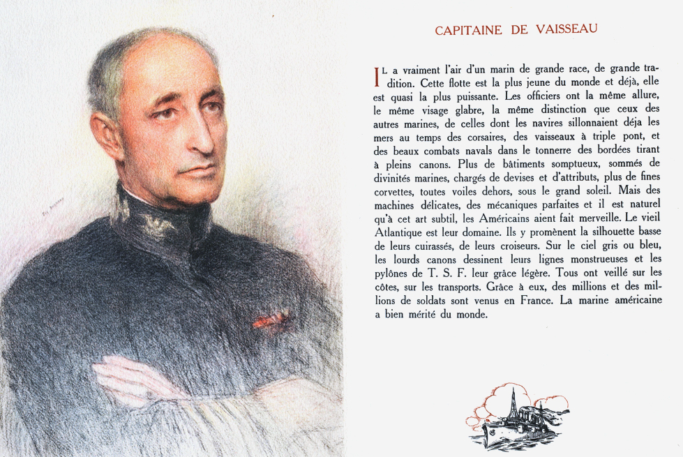 He truly has the air of a thoroughbred sailor from a great tradition. This fleet is the youngest in the world and already almost the most powerful.The officers have the same allure, the same smooth face, the same distinction as those of other navies, of those whose ships were already crisscrossing the seas in the time of pirates, triple decked ships, and great naval battles with the thunder of full broadsides of canons. No longer are there sumptuously built ships, ordered by sea-gods, loaded with money and valuables, nor are there neat corvettes, all sails aloft under the bright sun. But delicate machines, perfect mechanisms and it is natural that at this subtle art, the Americans should be wonderful. The old Atlantic is their domain. There the low silhouettes of their battleships, their cruisers, sail. On the grey or blue sky, the heavy guns draw their massive lines and the radio masts their feathery grace. All have watched over the coasts, the merchant ships. Thanks to them, millions and millions of soldiers have come to France. The American navy has merited the world
