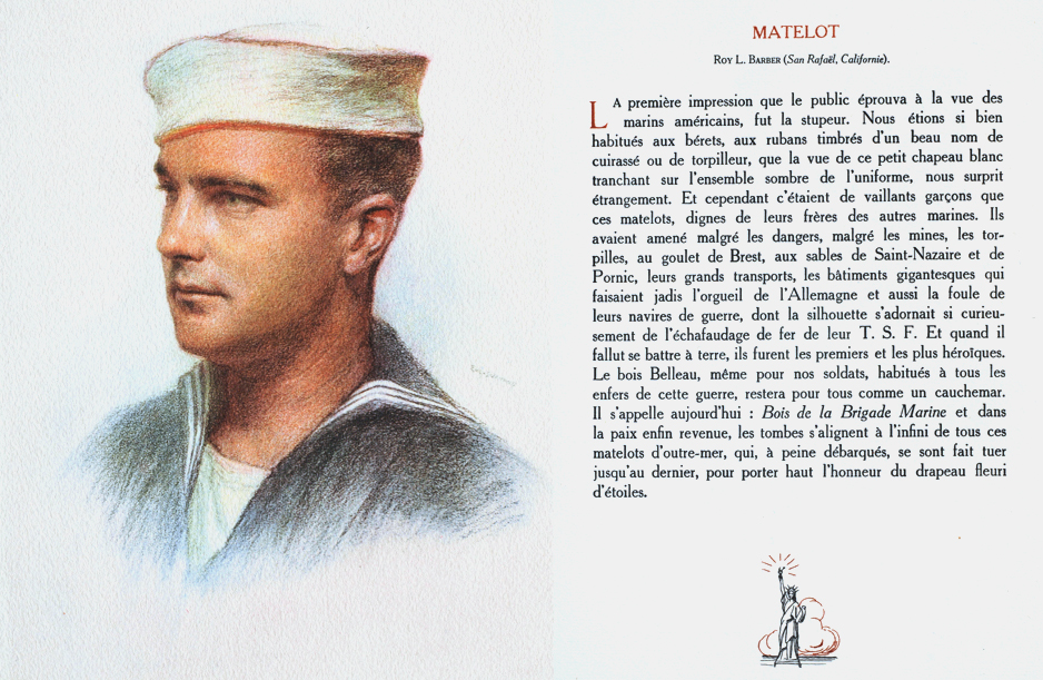 The first impression that the public experienced at the sight of American sailors, was astonishment. We were so habituated to berets, with a ribbon beautifully printed with the name of the battleship or torpedo boat, that the sight of that little white hat, sharp against the dark of the rest of uniform, strangely surprised us. And yet they were brave young men, these sailors, worthy of their brothers in other navies. They brought, in spite of the dangers, the mines, the torpedoes, to the bottleneck of Brest, at the sands of St. Nazaire and Pornic, the great transport ships, the gigantic vessels that were once the pride of Germany and also the crowd of warships whose silhouettes were adorned with curious iron frameworks for radio equipment. And when it was necessary to fight on land they were the first and the most heroic. The Belleau Wood (see in Wikipedia), even for our soldiers, used to the hell of this war, will remain a nightmare for all. Today it is called : Wood of the Marine Brigade and in the peace that eventually came, the graves line up endlessly, of all these sailors from overseas, who, just landed, fought to the last man to carry high the honour of the Stars and Stripes.