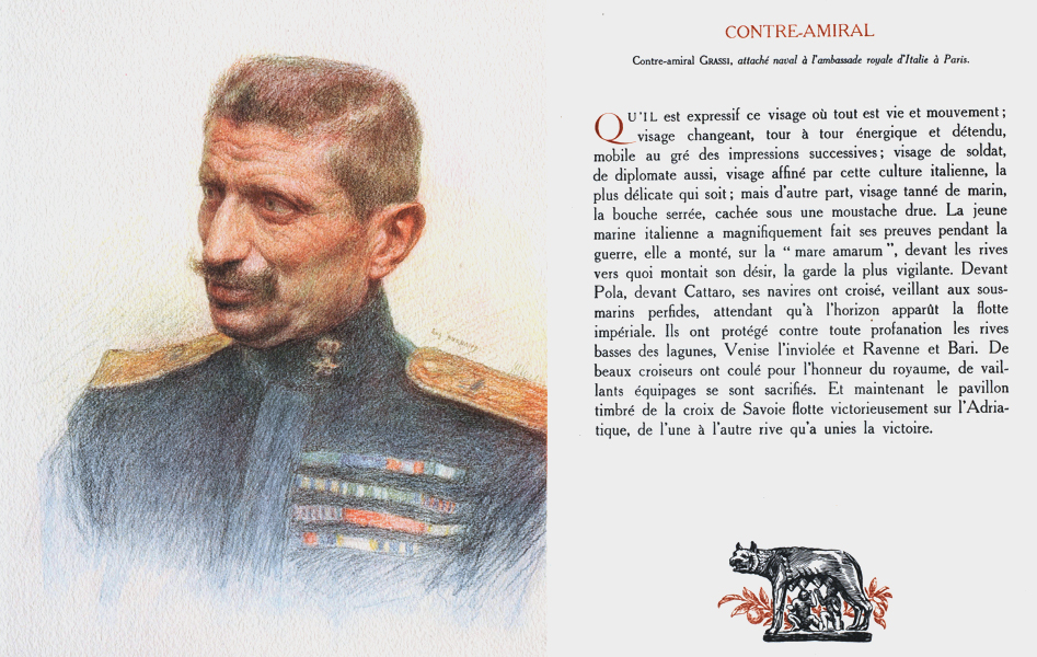 How expressive is this face, full of life and movement, a changing face, energetic and relaxed in turn, responding to successive feelings, face of a soldier, also of a diplomat, face refined by italian culture, the gentlest there is; but on the other hand, the tanned face of a sailor, mouth closed, hidden under a bushy moustache. The young Italian navy has passed the tests of war magnificently, it mounted guard on the ‘mare amarum’, facing the shores from where it could press its cause, the most vigilant guard. In front of Pola, in front of Cattaro its ships have cruised, keeping watch for perfidious submarines, looking out to the horizon in case the imperial fleet should appear. Against every violation they protected the low banks of the lagoons, Venice unharmed and Ravenna and Bari. Beautiful cruisers which were sunk for the honour of the Kingdom, valiant crews sacrificed themselves. And now the flag, embossed with the cross of Savoy floats victoriously on the Adriatic, from one shore to the other which victory has united.