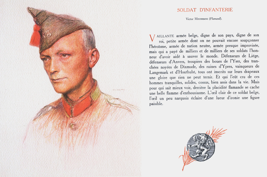 Valiant Belgian army, worthy of its country, worthy of its King, little Flemish army of which one could no longer doubt the heroism, army of a neutral country, hastily put together, but which paid with thousands upon thousands of soldiers for the honour of having helped to save the world. Defenders of Liege, defenders of Anvers, troopers of the mud of the Yser, of the flooded trenches of Dixmude, of the ruins of Ypres, victors of Langemark and of Houthulst, all have inscribed on their flags a glory that nothing could tarnish. And who would have believed it of those quiet, solid men, well-to-do and nicely set up in life. But for those who knew how to look further, behind the Flemish placidity is hidden a bright flame of zeal. The clear gaze of this Belgian soldier, a slightly mocking gaze, lights up his peaceable face with a flash of irony.