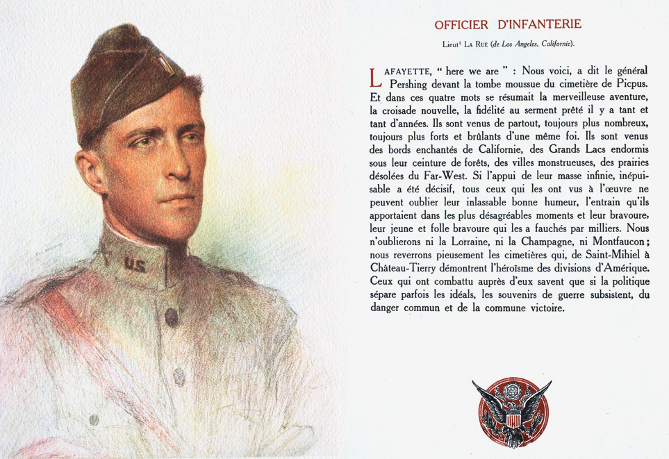 "Lafayette, here we are" said General Pershing (see in Wikipedia) in front of the mossy tomb in the Picpus cemetery (see in Wikipedia). And in those four words, the marvellous adventure was summed up, the new crusade, the fidelity to the oath taken so many years ago. They came from everywhere, always more numerous, always stronger and burning with the same faith. They came from enchanting coasts of California, from the Great Lakes sleeping under their forest belt, from monstrous towns, from the desolate prairies of the Far West. If the support of their infinite inexhaustible mass has been decisive, all those who saw them at work could not forget their tireless good humour, the spirit that they brought in the most unpleasant moments and their bravery, their young and crazy bravery that has cut them down in thousands. We will forget neither Lorraine, nor Champagne, nor Montfaucon; we will look piously at the cemeteries, which, from Saint Mihiel to Chateau-Thierry demonstrate the heroism of the American divisions. Those who had fought next to them knew that if politics sometimes separates from ideals, the memories of war remain, of the common danger and the common victory.